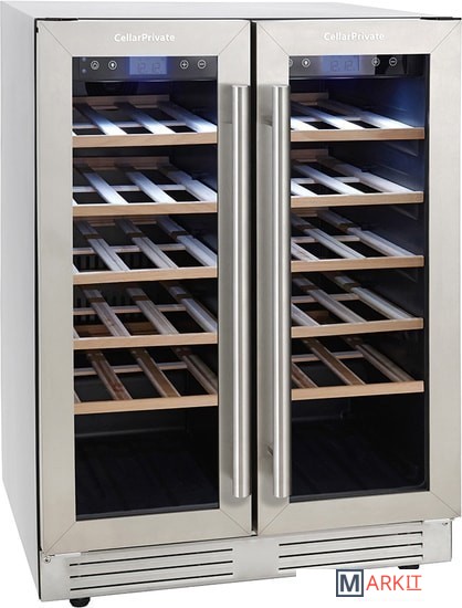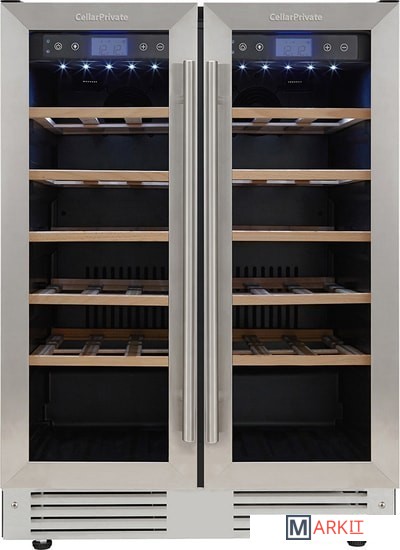 CellarPrivate CP042-2T это двухкамерный холодильник для вина, вместимостью до 42 бутылок. Температура выставляется в каждой камере раздельно, что позволяет хранить одновременно красные и белые вина.Температура в каждой камере настраивается от 5 до 20°ССенсорные кнопки управления температурой и подсветкой расположены на панели за стеклянной дверцей.Данная модель винного шкафа оснащена компрессорной системой охлаждения, за счёт чего его можно использовать в достаточно тёплом помещении, при этом он будет стабильно держать заданную температуру.CP042-2T можно встраивать в под столешницу либо в любую нишу, также можно использовать и как отдельностоящий винный шкаф. Высота регулируется при помощи ножек.Постоянное проветривание бутылок обеспечивается бесшумными вентиляторами, установленными внутри камер это предотвращает появление посторонних запахов и образование плесени. CellarPrivate CP042-2T оснащен десятью деревянными съёмными полками, на которых с легкостью разместятся любые бутылки.