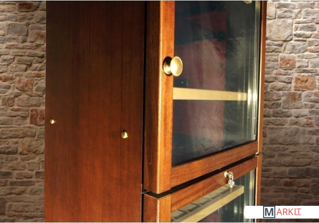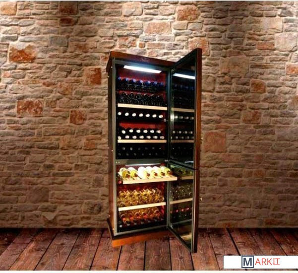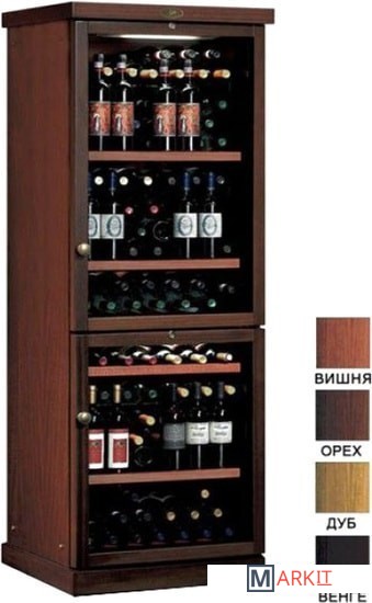 | Материал полок | металл, дерево (3 полки из металла с деревянной планкой, 1 полка из дерева полностью выдвижная и 5 полуполок из металла. Бутылки укладываются в ряд по глубине, либо выставляются вертикально) |