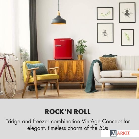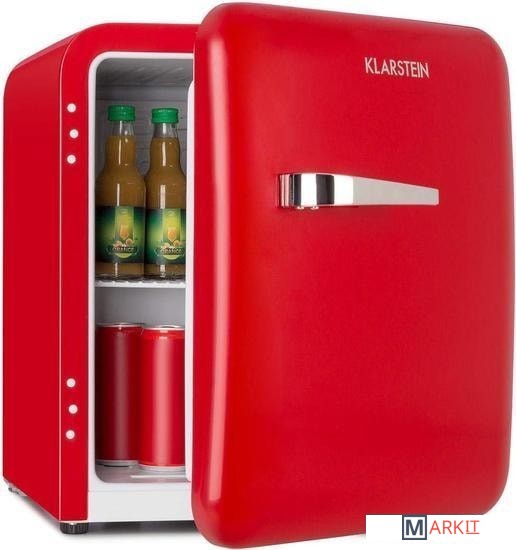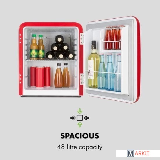 Емкость: 48 литров.Регулируемые по высоте ножки.Ретро-дизайн.Доступен в красном или синем и чёрном цвете.Отделение для бутылок и банок в дверце.Петля дверная: правая, не заменяемая.Внутреннее освещение.Размеры (без / с дверной ручкой): прибл. 44 x 50 x 49,8 / 55 см (ШxВxГ).Размеры (внутренний верхний уровень): прибл. 35,5 x 21 x 36,5 см (ШxВxГ).Размеры (внутренний нижний уровень): прибл. 35,5 x 19 x 21 см (ШxВxГ).Размеры (большой дверной отсек): прибл. 30,5 x 36,5 / 22 x 7,5 см (ШxВxГ).Размеры (дверное отделение маленькое): прибл. 15,5 x 13,5 x 7,5 см (ШxВxГ).