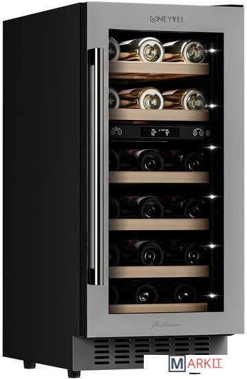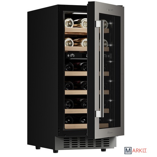 Винный шкаф Meyvel MV28-KST2Модель MV28-KST2 имеет привлекательный внешний вид, сочетающий в себе неподвластное времени очарование натуральных материалов с высокотехнологичными системами сохранения продуктов. Винный холодильник Meyvel MV28-KST2 оснащен дверью с защитой от ультрафиолетовых лучей и отлично подойдет для хранения и созревания различных сортов вин. Динамическая система охлаждения обеспечивает оптимальную температуру для вина и сохраняет необходимую влажность внутри камеры.Универсальный микроклиматКомпрессорный винный шкаф Meyvel MV28-KST2 обладает большой вместимостью и даёт возможность разместить до 28 бутылок стандартного типа Бордо (0,75 л). Располагаются они на выдвижных полках из дерева. Внутреннее пространство шкафа разделено на 2 температурные зоны, с возможностью настраивать каждую из них. Общий диапазон температуры у данной модели от +5°C до +20°C.Сенсорный дисплейБыстро задавайте необходимую температуру для содержимого и управляйте всеми функциями холодильника с помощью интуитивно-понятного расположения клавиш на сенсорном дисплее.Комфортное расположениеMeyvel MV28-KST2 отлично подходит для расположения на любой кухне. Шкаф можно встроить под столешницу, а так же, перенавесить дверь для более удобного использования (петли входят в комплект).