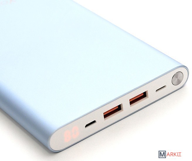 Аккумулятор имеет 2 выхода по 2.1А каждый, а также 2 входа для зарядки самого устройства через Lightning (Apple) и Micro-USB с силой тока по 2A, а специальный индикатор в форме LED–дисплея на фронтальной части аккумулятора всегда подскажет Вам актуальный уровень оставшегося заряда.