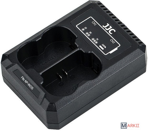 JJC DCH-NPW235 USB двойное зарядное устройство на два аккумулятора Fujifilm NP-W235 со встроенным USB кабелем и индикатором уровня зарядкиКомпактный дизайн, высокое качество, прочный корпусВремя зарядки зависит от емкости аккумулятораКомпактный и портативный дизайн. Индикатор мигает во время зарядки и постоянно горит когда аккумулятор заряжен. Так же дисплей зарядного устройства показывает процент заряда каждого аккумулятора. Вы можете заряжать как два аккумулятора, так и один.Встроенная система защиты от перезаряда и перегрева аккумулятора.Когда батарея только начинает перегреваться, зарядное устройство немедленно прекратит зарядку. Кроме того, зарядное устройство автоматически обнаружит когда батареи полностью заряжены и прекратит зарядку, чтобы предотвратить повреждение ваших аккумуляторов.Зарядное устройство подключается через USB порт, что позволяет заряжать аккумулятор от огромного числа устройств. Кабель USB интегрирован в корпус зарядного устройства и укладывается в специальные пазы корпуса. Заряжайте аккумулятор Fuji NP-W235 дома, в студии и в дороге! (если в автомобиле есть USB разъем или USB адаптер в "прикуриватель").