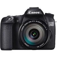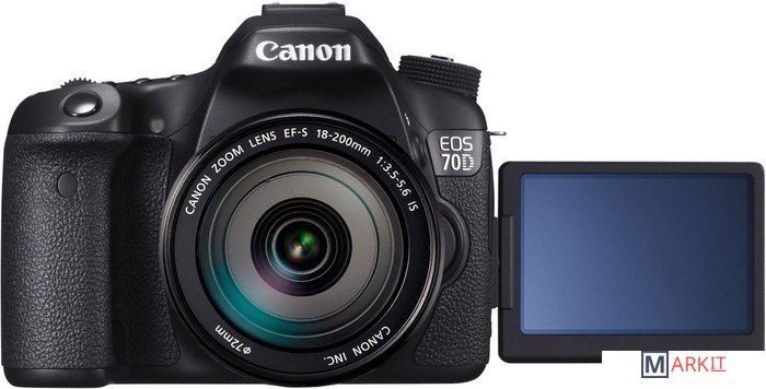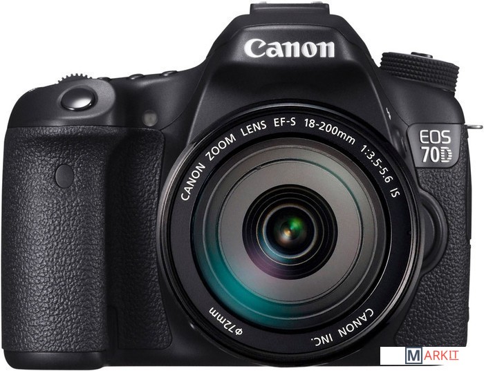 Неполнокадровый зеркальный цифровой аппарат, ориентированный на широкий круг пользователей. EOS 70D пришёл на смену сверхпопулярной модели EOS 60D: камера получила новую 20.2 Мп. CMOS-матрицу с кроп-фактором 1.6, с расширенным штатным диапазоном чувствительности: от 100 до 12800 ISO, 3” поворотный сенсорный дисплей. Камера может вести съемку со скоростью 7 кадров в секунду. Так же имеются модули Wi-Fi/NFC. Комплект с объективом Canon EF-S 18-200mm f/3.5-5.6 IS.