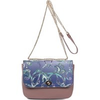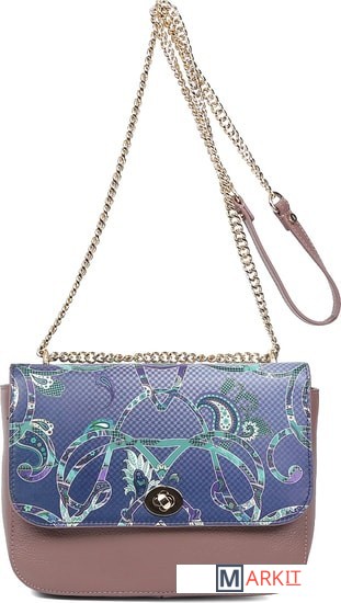 Привлечь внимание окружающих возможно, если дополнить образ сумкой кросс-боди итальянского бренда FABRETTI. В ее дизайне выделяется абстрактный яркий принт в виде узора пейсли на контрастном приглушенном фоне. Основное отделение закрывается на клапан с замком. Внутри сумки и на тыльной стороне расположены карманы для мелочей. Элегантный образ завершает длинная ручка в виде цепочки "под золото".
