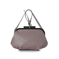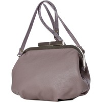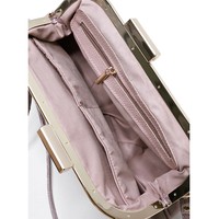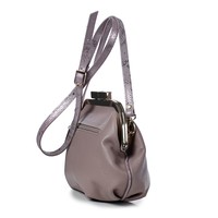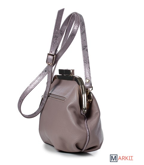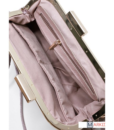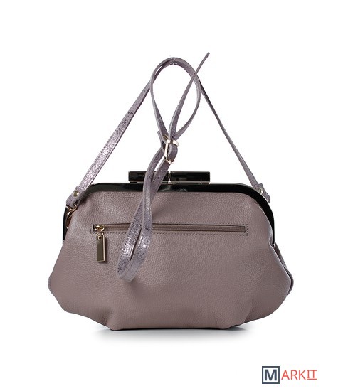 Сумка из натуральной кожи закрывается на рамочный замок, с одной съёмной ручкой-ремнём на карабинах, со складками на стенках и прокладкой кедера, на задней стенке карман, закрывающийся на застёжку-молнию. Сумка на подкладке, с открытым карманом с украшением, с подвесным карманом, закрывающимся на застёжку-молнию, с накладкой на кармане.