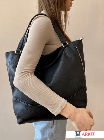 Сумка из искуственной кожи на одно отделение, закрывающееся на застежку-молнию, с двумя ручками длиной 460+-10мм, с карманом на задней стенке, закрывающимся на застежку-молнию. По боковым сторонам сумки вставки с декоративными молниями. Сумка на подкладке, с нашивкой с тиснением на подкладке, с открытым карманом, с карманом-перегородка, закрывающимся на застежку-молнию, соединенным с задней стенкой з/магниткой.